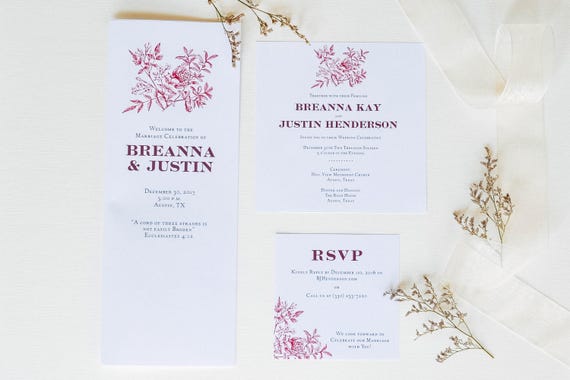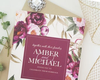 Burgundy Floral Wedding Invitation Rustic Wedding Invitation
