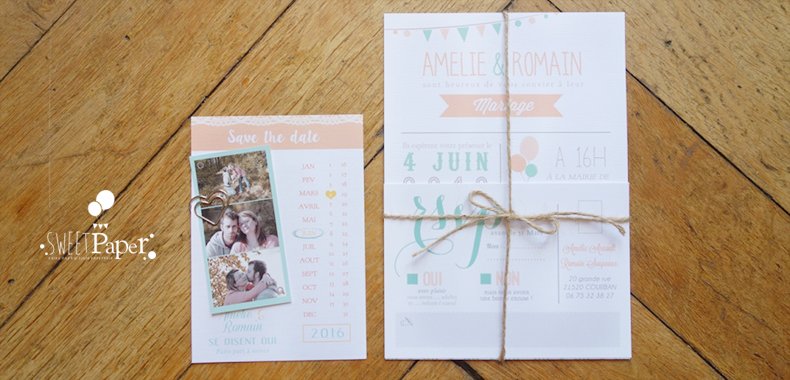 Faire Part Mariage Retro Romantique Mint Peche Sweet Paper