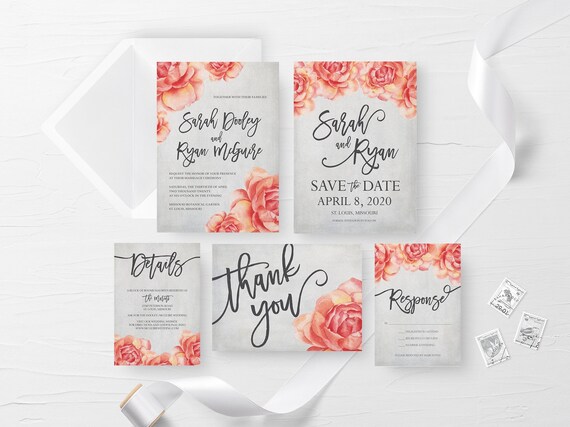 Peche Inviter Faire Part Mariage Imprimable Floral Corail Etsy